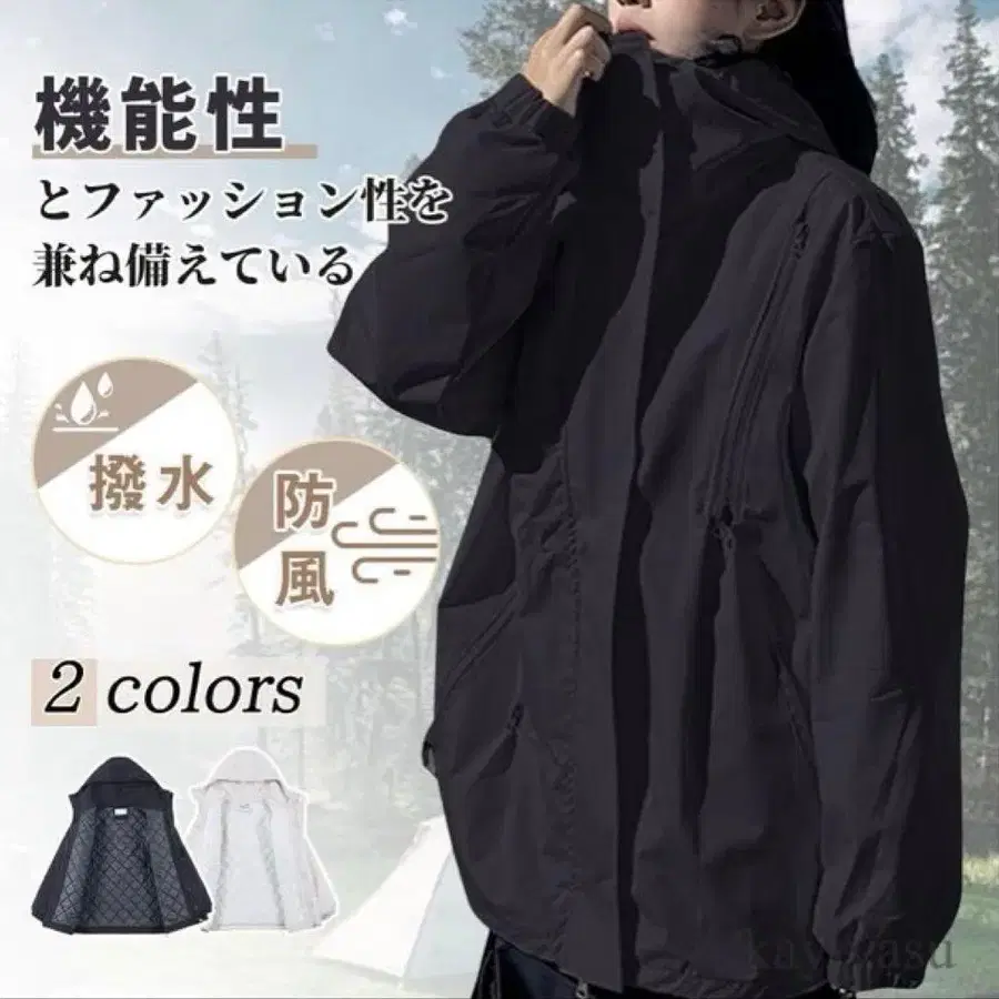 윈드 브레이커의 표면은 발수 가공 소재를 사용하여 빗물 침투를 막아줍니다. 후드 부착, 안감은 충전솜으로 되어 있으며, 지퍼 외부에는 벨크로 테이프가 있어 추운 겨울에도 공기가 들어오는 것을 막을 수 있습니다.