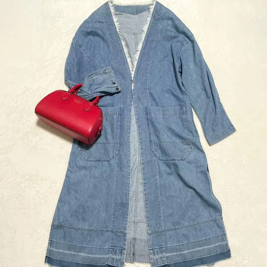 맥피의 데님 소재 라이트 블루 롱 코트. 옷깃은 프린지, 프론트는 실버 금장 장식으로 잠글 수 있습니다!