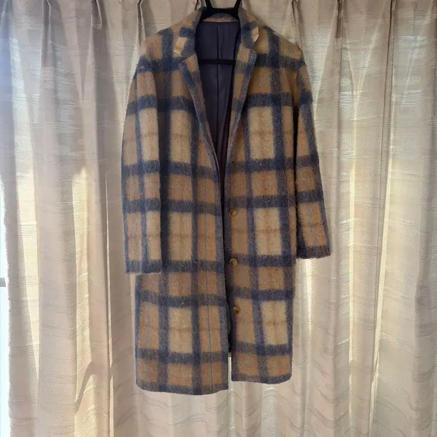블루프론세 베이지와 파랑 체크 무늬 롱 코트