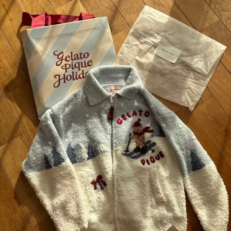 [ HOLIDAY 전면에 설경을 그린 스키 베어 가디건 ] [ Design/Styling ] 가족, 친구, 소중한 누군가와 보내는 따뜻한 홀리데이 시즌에 어울리는 베어 모티브 룸웨어 시리즈입니다. 눈 덮인 산을 스키 타고 소중한 사람에게 선물을 운반하는 베어를 패널로 대담하게 표현한 카라 부착 가디건입니다. 눈 부분에는 털이 긴 '젤라토' 실을 사용했으며, 가슴에는 사가 자수 로고도 더해 질감을 풍부하게 완성했습니다. 카라가 있어 목까지 따뜻하며, 지퍼 손잡이가 베어 머플러와 같은 디자인인 것도 귀여운 포인트입니다. 빨간 머플러와 니트캡을 착용한 베어의 표정과 스토리성을 느끼게 하는 배경의 그림체에도 신경 쓴 스페셜한 아이템입니다. 색상은 낮의 하늘을 느끼게 하는 민트와 밤하늘을 느끼게 하는 네이비 두 가지 색상으로 준비했습니다. 같은 시리즈의 롱 팬츠와 함께 입거나, HOMME 사이즈와 링크 코디네이트도 즐기실 수 있습니다.