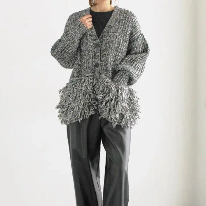 트렌드의 프린지를 활용한 주역급 니트 가디건입니다.