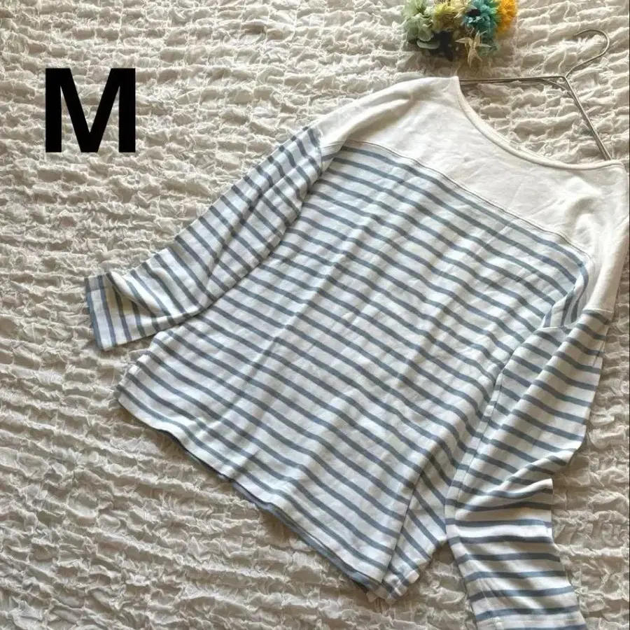 보더 티셔츠 긴팔 오버 사이즈 코튼 100% 화이트/연한 스카이블루 M