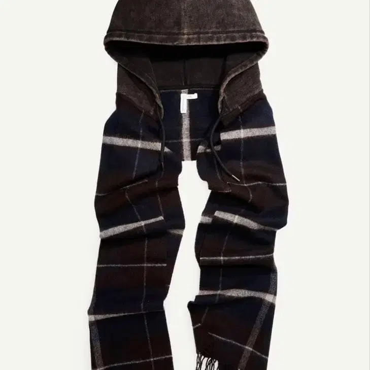 펠트 가공한 울 직물 소재를 사용한 머플러. 2겹으로 된 드로우 스트링 후드가 부착되어 있습니다. 후드는 워싱한 듯한 질감의 코튼 맨투맨 소재입니다. 양 끝은 프린지 마감. 뒷면에 브랜드 로고 자수가 들어간 아플리케가 장식되어 있습니다.