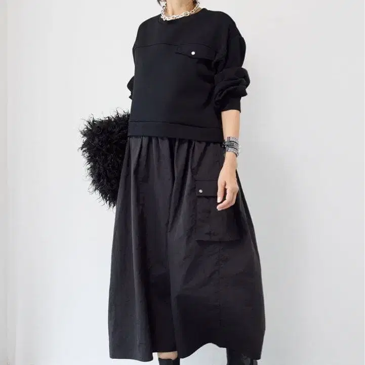맨투맨 상의와 나일론 느낌의 스커트를 조합한 이소재 도킹 원피스. 캐주얼한 착용감이지만, 입체적인 실루엣과 광택 있는 소재감이 성숙한 고급스러움을 더합니다. 가슴 부분과 스커트의 포켓 디자인이 악센트가 되어, 심플함 속에 개성을 느낄 수 있는 아이템입니다. 허리 절개로 밸런스 좋게 스타일업하며, 부츠와도 궁합이 좋습니다. 데일리룩이나 외출복으로도 활약하는, 내추럴 무드의 모드 캐주얼 원피스입니다. 시착만 한 상품으로 자택 보관 중입니다. 비교적 깨끗한 상태라고 생각하지만, 자택 보관을 이해해 주시는 분께. 개인의 검품/판매이므로, 얼룩, 흠집 등의 누락이 있을 수 있습니다. 또한, 색감의 이미지 차이 등, 직접 보고 구매하실 수 없다는 중고거래의 특성을 이해하신 후에 부탁드립니다. 사이즈: F 상의 기장 48cm 총길이 123cm 가슴 너비 51cm 어깨 너비 52cm 소매 너비 11/10.5cm 소매 길이 52cm 상의 밑단 폭 51cm 스커트 밑단 폭 92cm 색상: 블랙 계열 소재: 면 75% 폴리에스테르 25% 안감: 폴리에스테르 95% 폴리우레탄 5% (별도 천) 나일론 100% 가격: 14,080엔