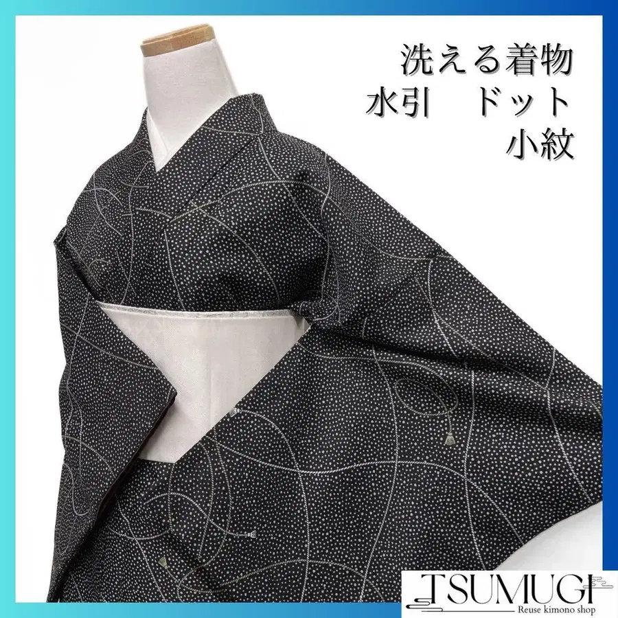 코몬 워셔블 기모노 도트 미즈히키 블랙 베이스 기모노 023a d