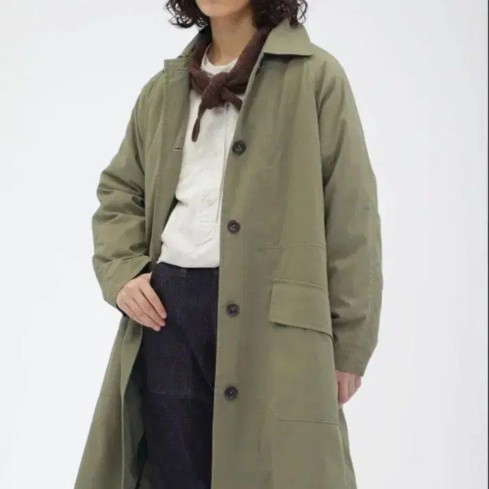 발수 가공을 더한 코튼 나일론 소재의 워크 코트. 미세하게 기모를 낸 드라이하고 매트한 질감. 코튼과 나일론의 염색 차이로 생기는 색상의 깊이와 빈티지한 느낌이 포인트. 큰 옷깃과 A라인의 스윙 실루엣이 특징적인 디자인으로, 워크 코트다운 디테일에도 신경 쓴 아이템. 탈부착 가능한 다운 라이너가 포함되어 있으며, 라이너를 제거하면 한 겹으로 되어 있어 오래 착용하기 좋은 가벼운 착용감.