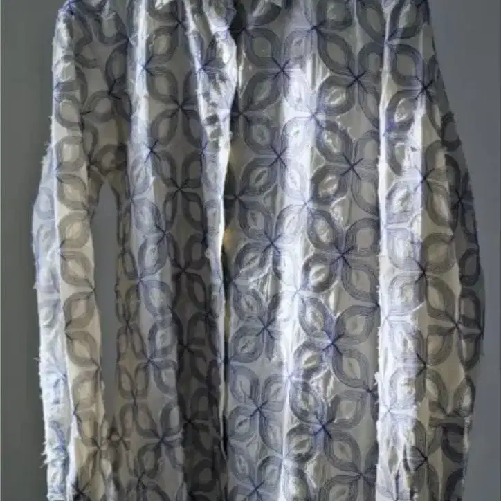 PERIOD FEATURES / 피리오드 피쳐스 ] 'CUT OUT' Hand Clipping Shirt 사이즈 4 ※ 마티는 아닙니다. 이하 인용 몇 시즌 전부터 불규칙적으로 출시되는 'CUT OUT' 시리즈의 최신작입니다. 생지의 평직 원단과 메쉬 원단을 겹쳐 기하학 패턴을 고밀도로 자수한 후, 메쉬 원단을 수작업으로 한 패턴씩 잘라내는 정신 나간 제법으로 만들어진 1벌입니다. 베이스인 인도 면 원단은 세탁할수록 질감이 더해지면서 화이트에 가까워지고, 표면의 메쉬 원단이 서서히 부서지면서 독특한 표정을 계속 업데이트하는, 이 브랜드만의 너무 재미있는 원단입니다. 이것만으로도 충분하지만, 프론트 버튼을 잠갔을 때의 패턴 맞춤도 완벽하여 그 아름다움에 감탄하게 됩니다. 언뜻 보기에는 강렬하게 느껴질 수 있지만, 아이보리 x 블루의 배색 자체는 코디하기 쉽습니다. 단품으로 입는 것은 물론, 안에 무언가를 받쳐 입거나 자켓의 이너로도 좋습니다. 넉넉한 사이즈, 레귤러 실루엣으로 준비했습니다.