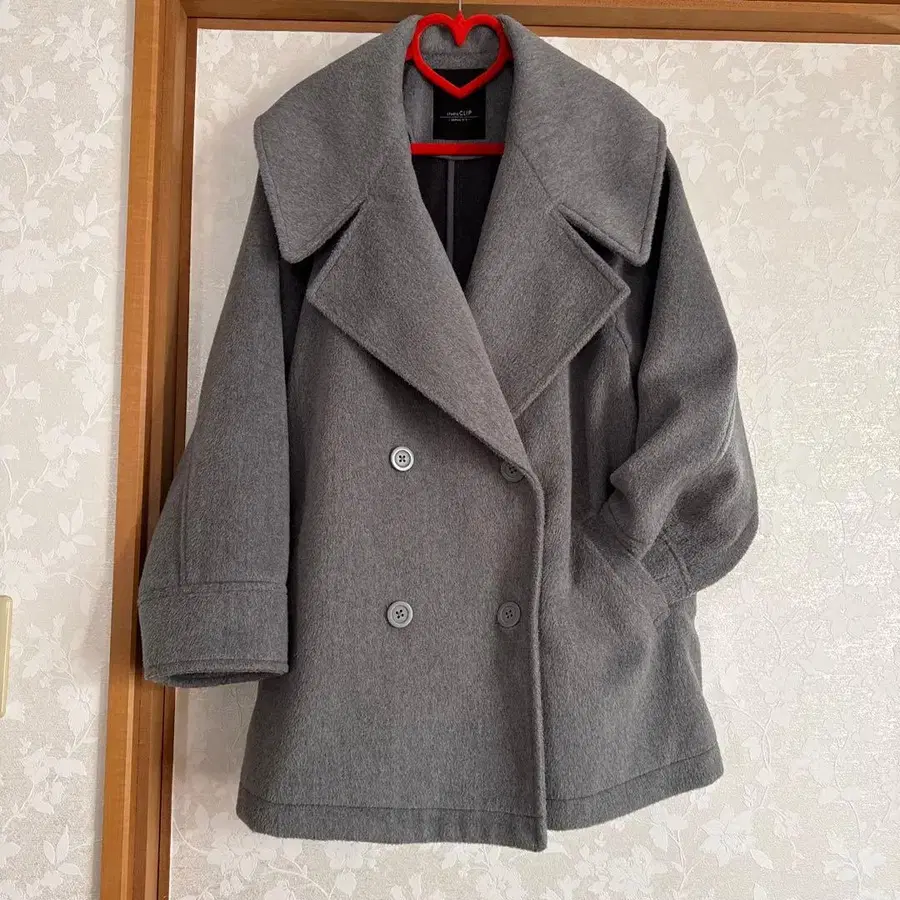 큰 옷깃과 더블 브레스트 디자인의 그레이 코트
