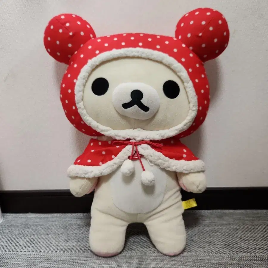 겨울 계절에 딱 맞는 차림 리락쿠마 빨간색 도트 후드를 착용