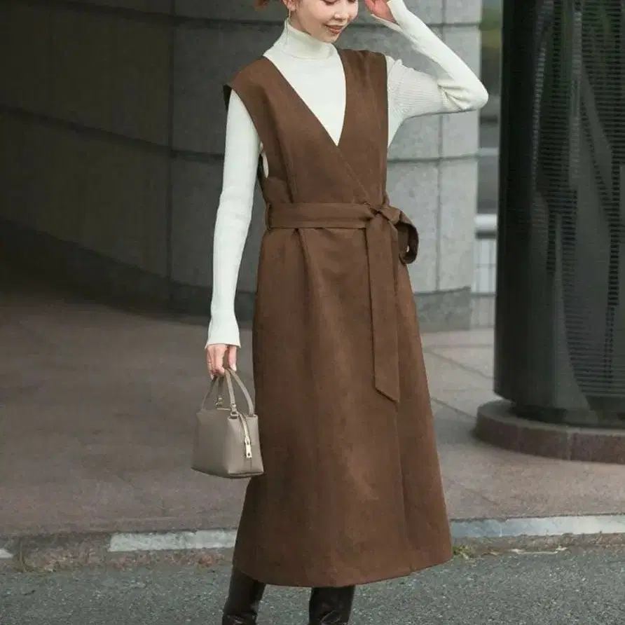 다크 브라운의 스웨이드풍 슬리브리스 랩 드레스, 허리 리본 포함으로 스타일리시