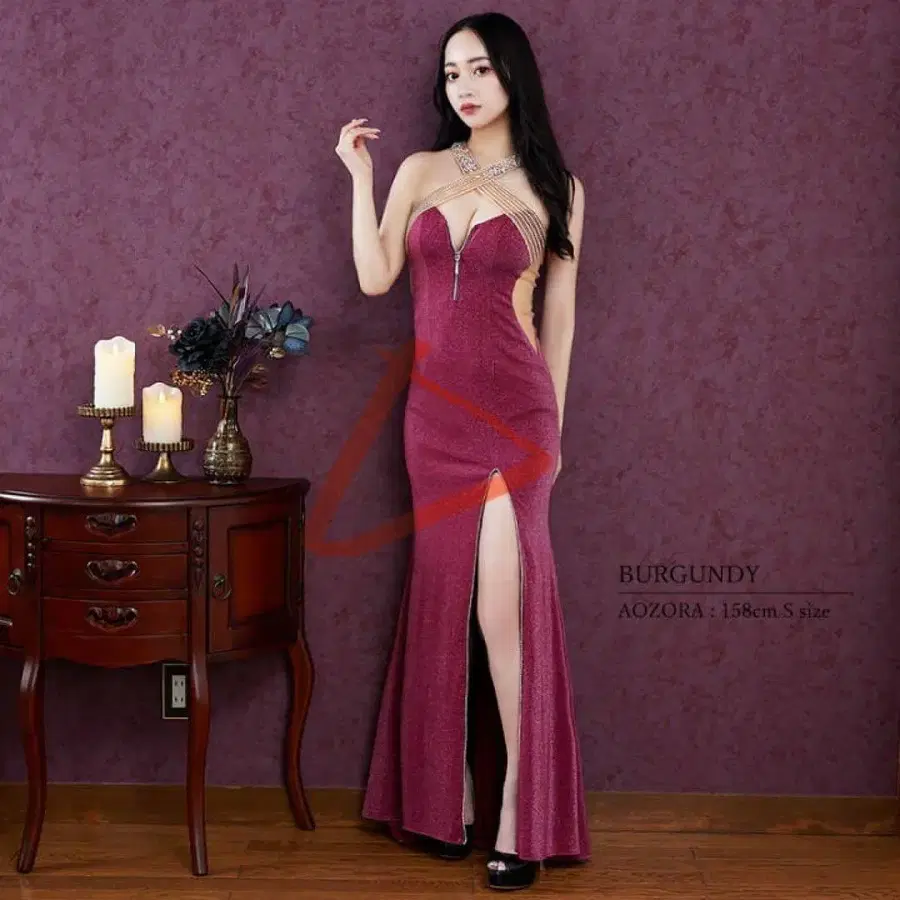 스트랩이 달린 버건디 색상의 글리터 소재 드레스, 하이 슬릿 디자인으로 매력적입니다.