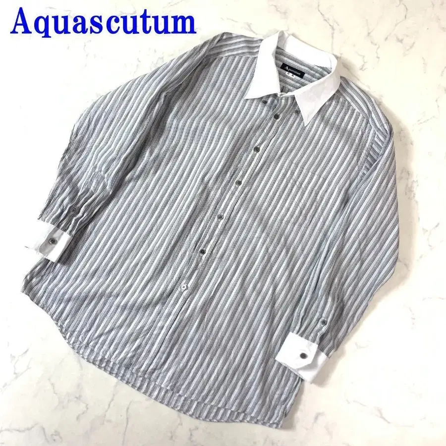 Aquascutum 긴팔 셔츠 그레이 화이트 스트라이프 면 L C2395