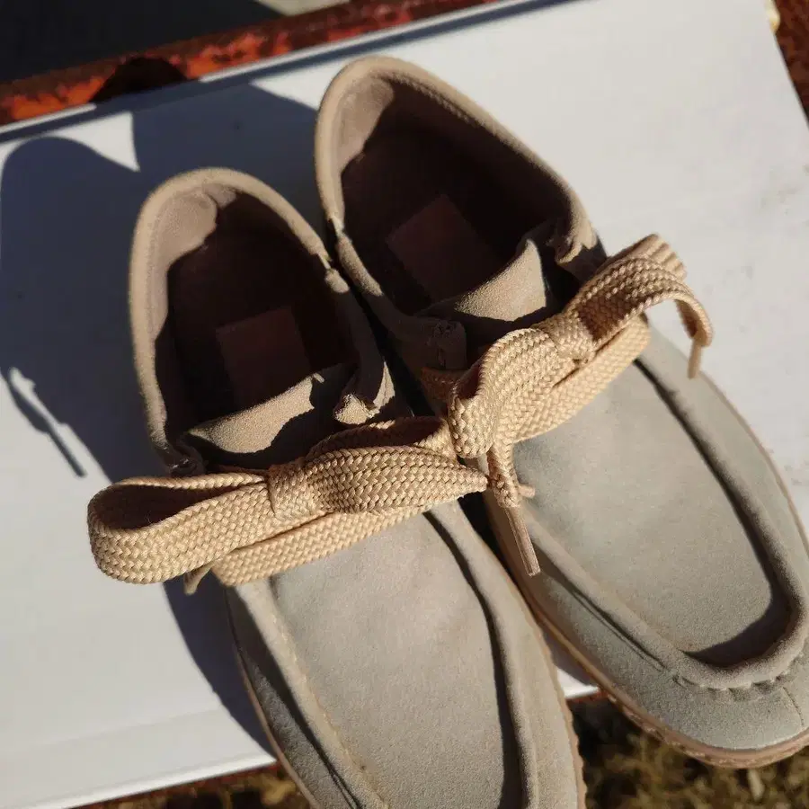 스웨이드 소재의 라이트 베이지 모카신입니다. 앞면에 리본 디테일이 있습니다. 구매 후 밖에서는 신지 않았습니다. 방문해 주셔서 감사합니다.