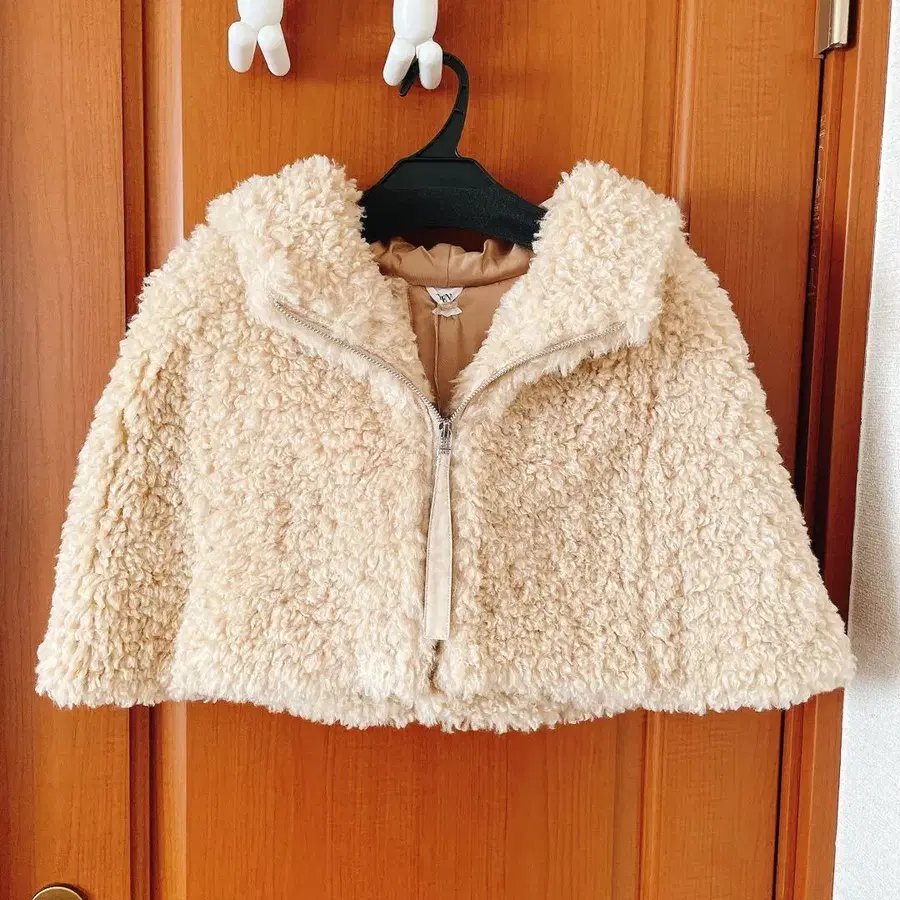 후드 부착 베이지 보아 소재의 숏 기장 아우터.