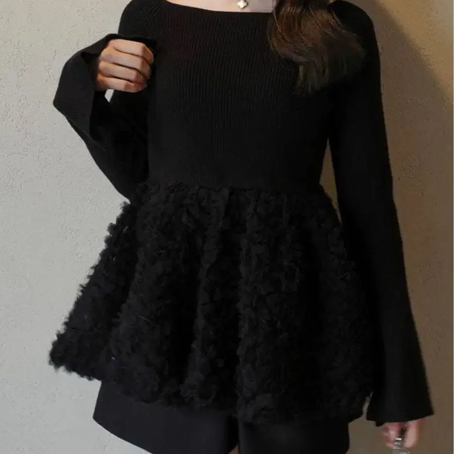 살랑이는 튤 소재로 절개한 페플럼 디자인이