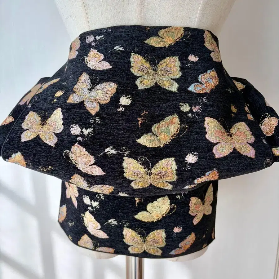 블랙 베이스에 핑크, 골드, 그린, 금실로 짜여진 나비 패턴