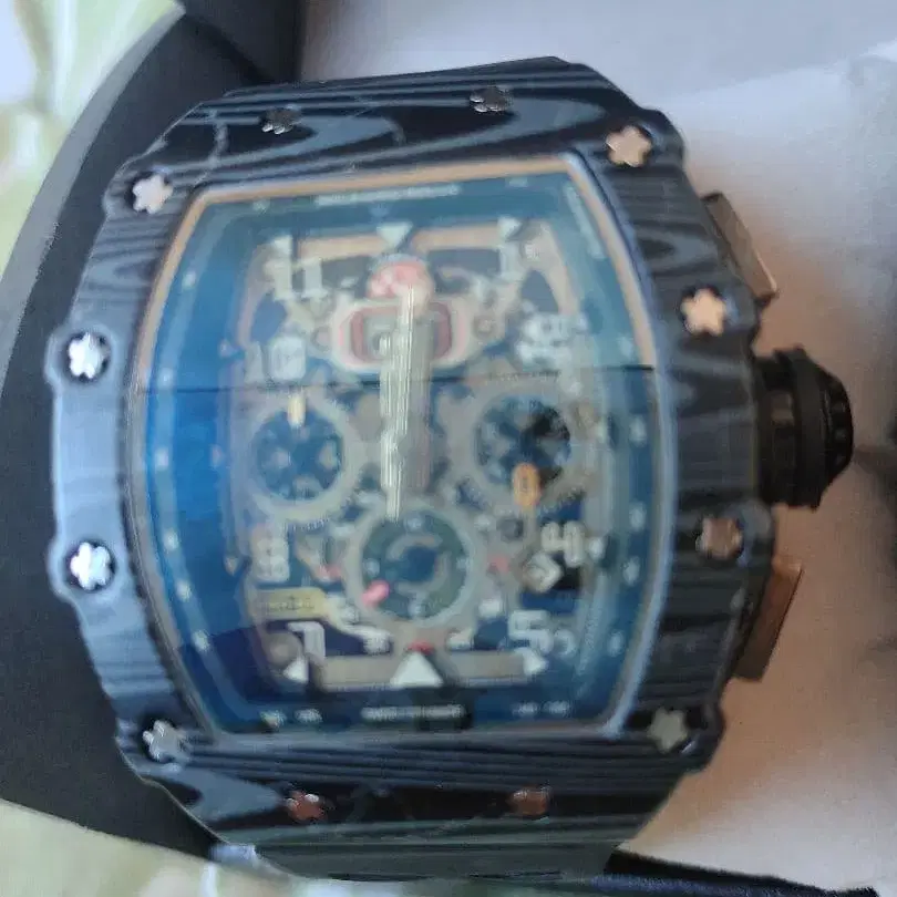 리샤르 RM 11-03 타입 (프린트 있음) 고무 벨트 블랙 무광택 케이스 창문 숫자 프린트 해외 기념품으로 받았으나 미사용 상태로 방치되어 있었습니다 용두 위 버튼을 누르면 초침 구동 아래 버튼을 누르면 12시 부분으로 돌아감 스톱워치 기능 있음 흠집 등은 없습니다