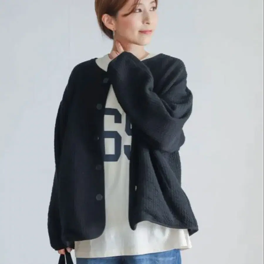 가을 아우터로는 물론, 코쿤형 암 디자인도 넉넉하여 볼륨 슬리브나 니트 위에도 겹쳐 입기 좋으며, 계절이 깊어진 후의 겉옷으로도 활약합니다.