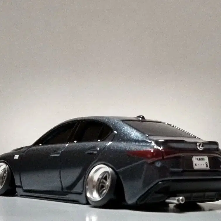 : 섀시 깎기 + 펜더 안쪽 깎기 & 블랙 페인팅 츠라이치 샤코탄 타이어 고정 (타이어와 지면의 접지면은 평평하게 했습니다).