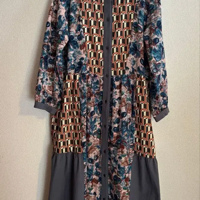 플라워와 아치 무늬의 멀티 컬러 원피스, 긴팔, 버튼 포함.