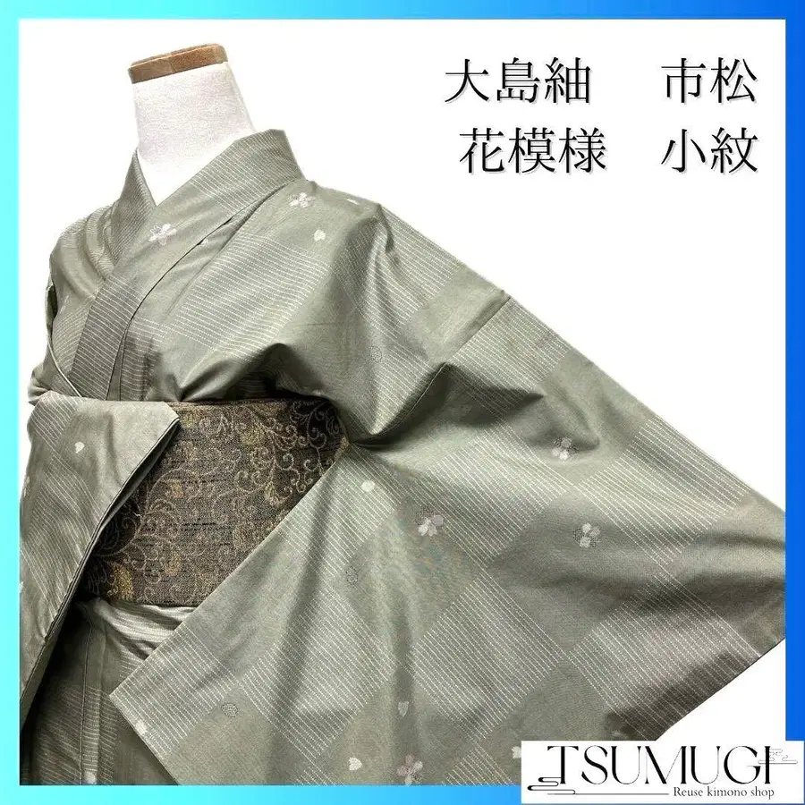 오시마 명주에 체크 패턴과 꽃 무늬, 꽃잎이 짜여진 코몬입니다.