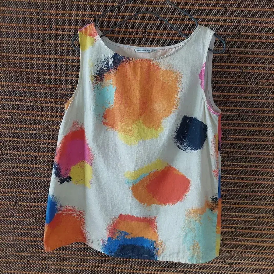 자동 번역되었어요. 원문보기[ 가성비 ] Marimekko, 추상적인 페인트 패턴의 멀티 컬러 탱크탑. 2만 엔 이상이었던 것으로 기억합니다. 홈 클리닝 후 다림질하여 바로 사용하실 수 있습니다. 기재된 사이즈는 34로 S 또는 XS에 해당할 것으로 보이나, 실제로는 크게 나왔습니다. 저는 평소 M 사이즈를 착용합니다. 치수 측정을 참고해 주세요. 특별히 기재할 만한 큰 데미지는 없어 보이나, 중고품 및 자택 보관에 이해해 주시는 분은 잘 부탁드립니다. 겨드랑이 아래 평평하게 놓았을 때 너비 44.5cm, 기장 약 58cm입니다. 귀여운 상품입니다.
