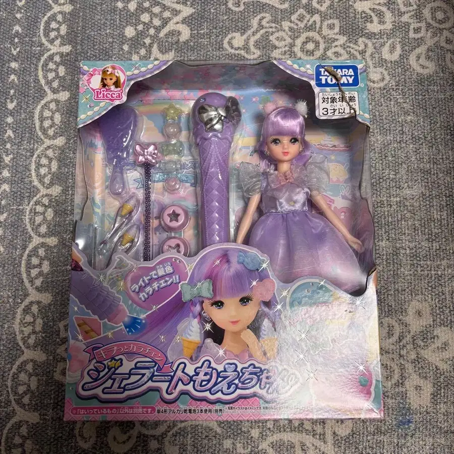 보라색 드레스와 액세서리가 부속된 리카짱 인형, 컬러 체인지 기능 포함.