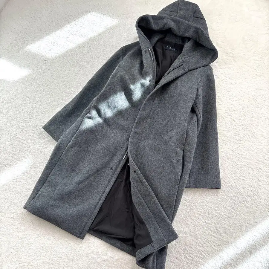 고급 울 소재를 사용한, 차분한 그레이 색상의 후디 부착 코트입니다.
