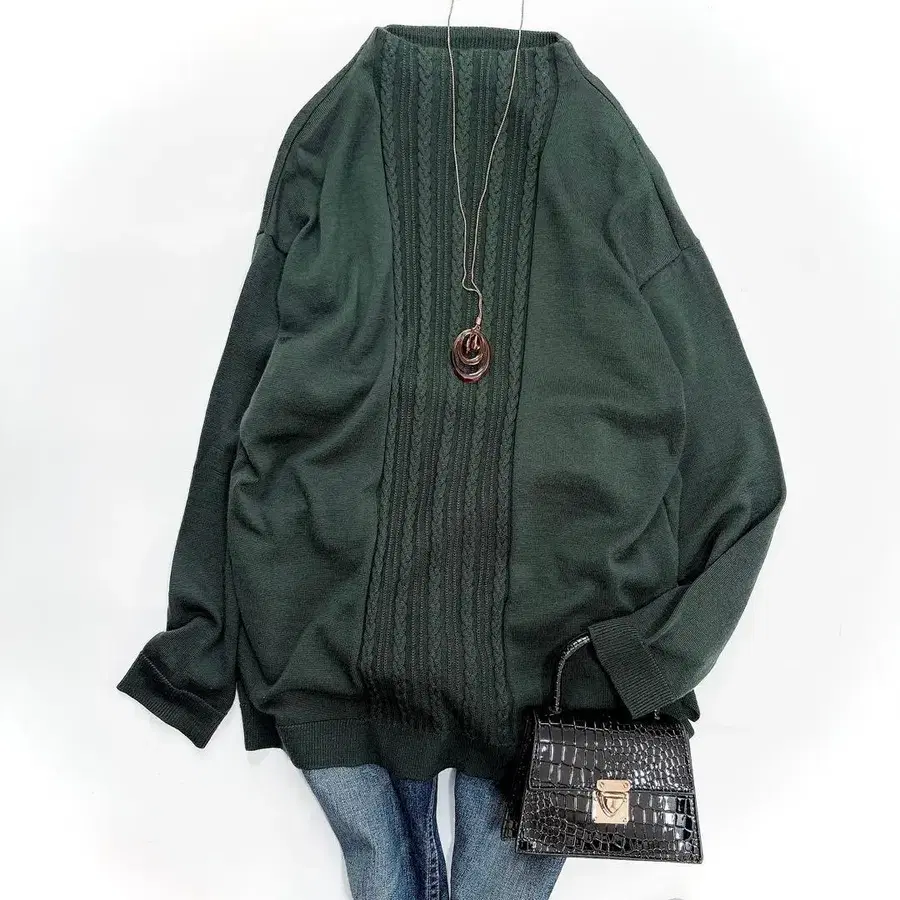 프론트 중앙에 은은한 케이블 짜임의 세로 라인이 들어가 있어, 몸의 라인을 드러내지 않는 넉넉한 실루엣으로 체형 커버를 하면서 날씬해 보입니다.