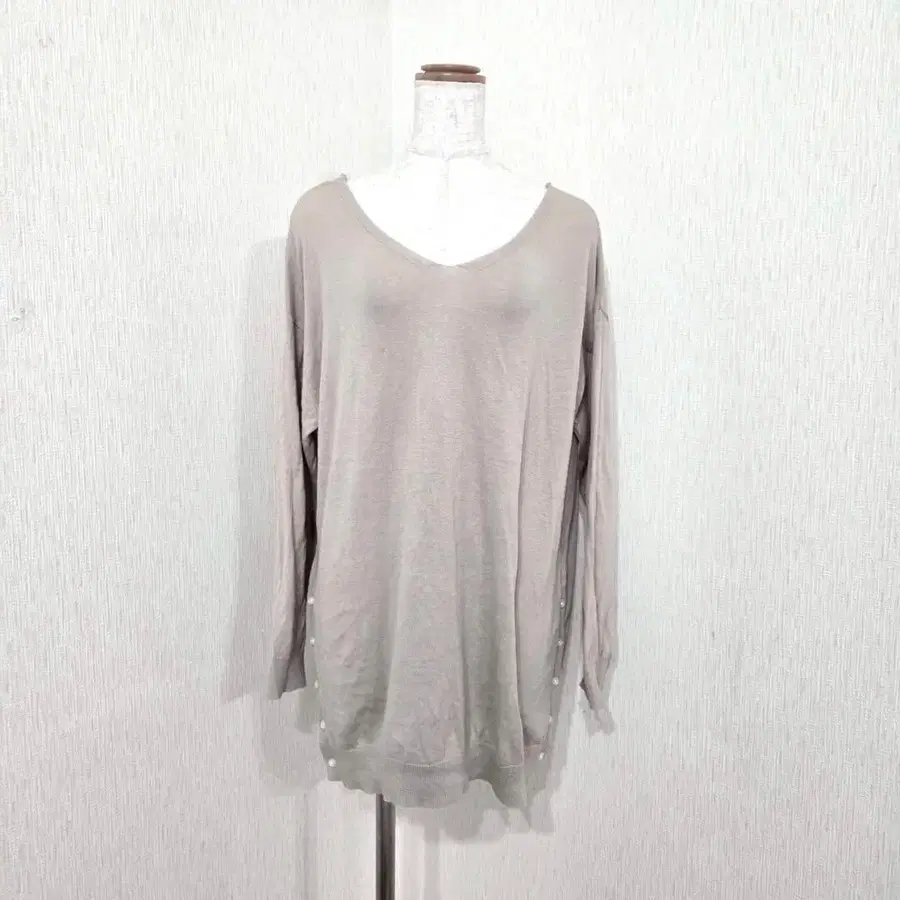 포근하고 부드러운 질감의 베이지 니트탑. 양쪽 사이드에 버튼이 달린 슬릿으로 어레인지도 가능합니다.