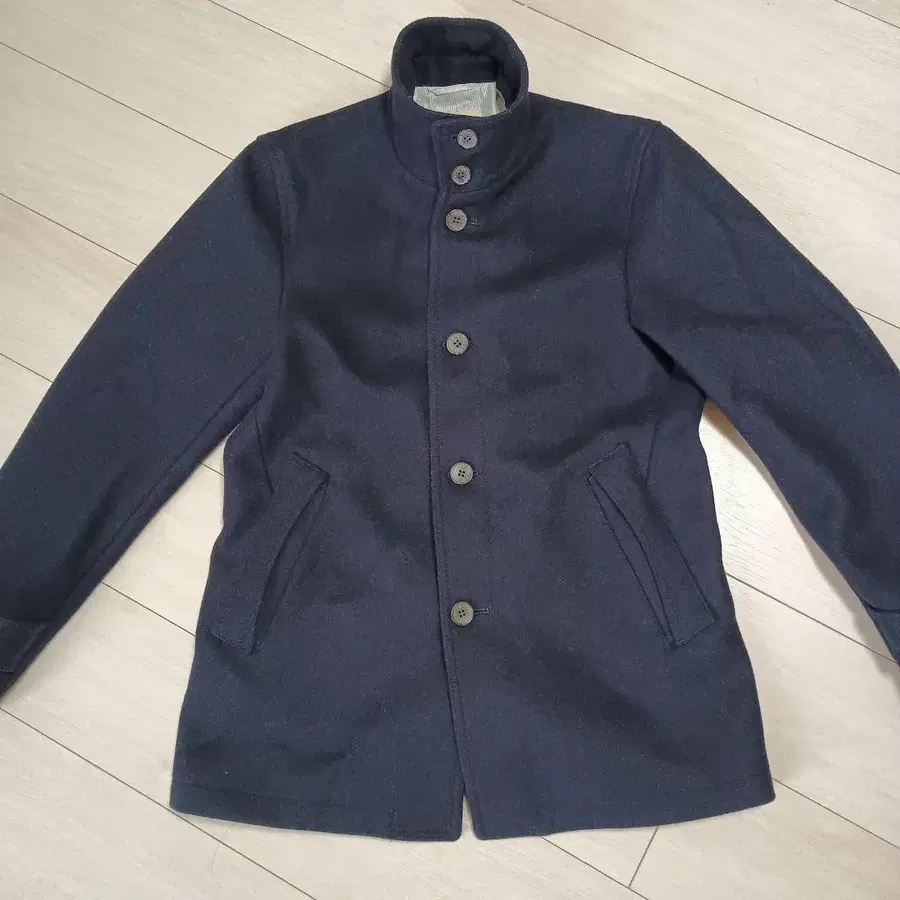 울 스탠드 카라 코트 네이비