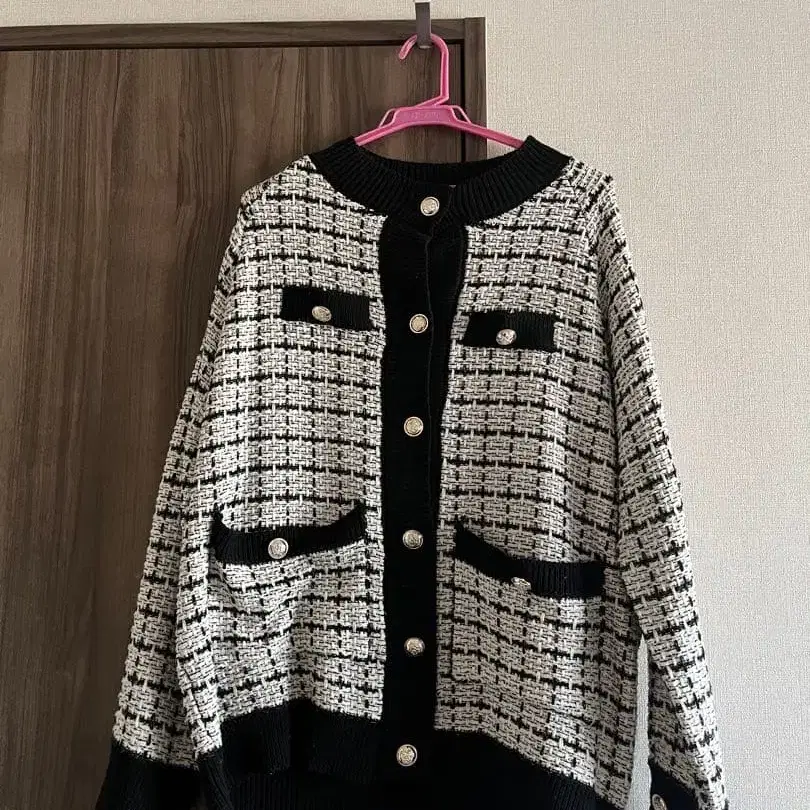 트위드풍 디자인의 화이트 블랙 가디건으로, 버튼과 포켓이 있어 스타일리시합니다.