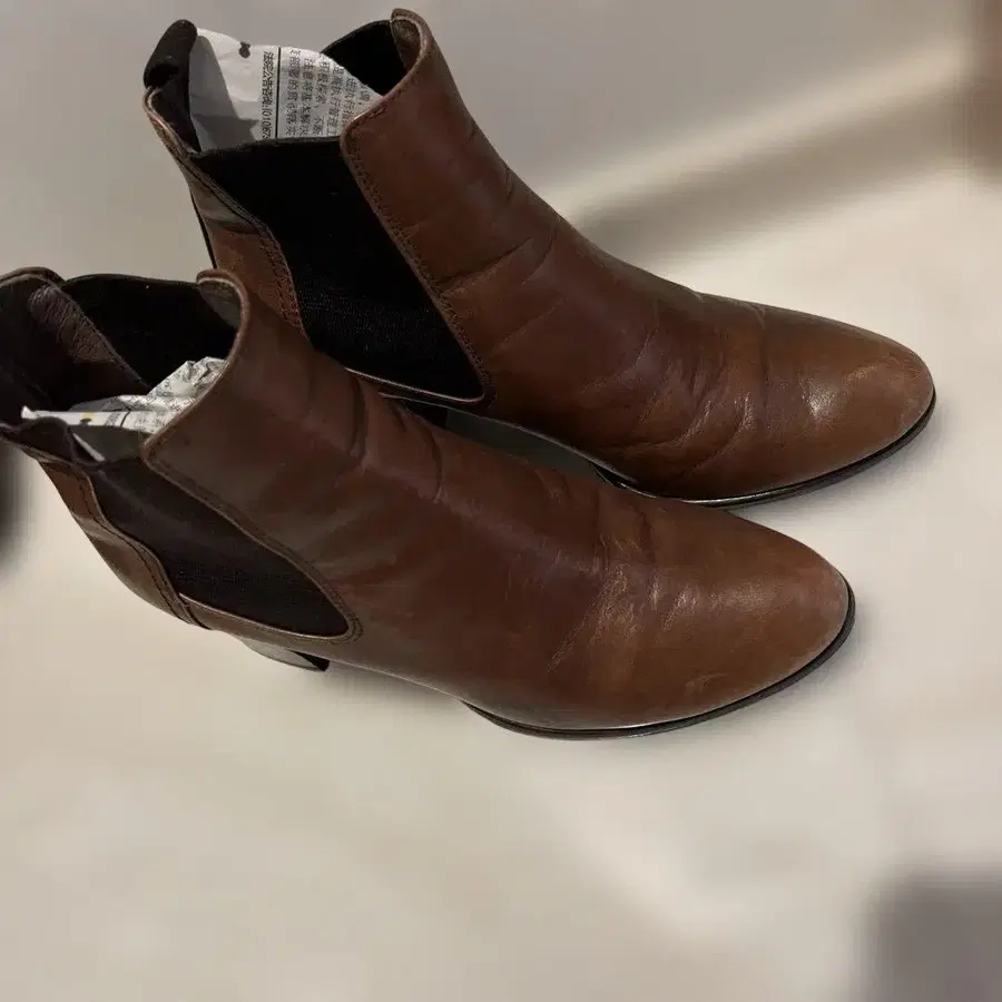 브라운 가죽 사이드 고어 부츠 중간 힐