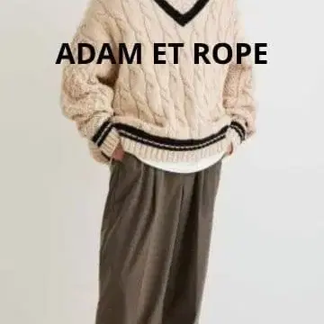 아이보리와 네이비 색상의 V넥 케이블 짜임 스웨터, 리브 짜임 디테일이 특징입니다.