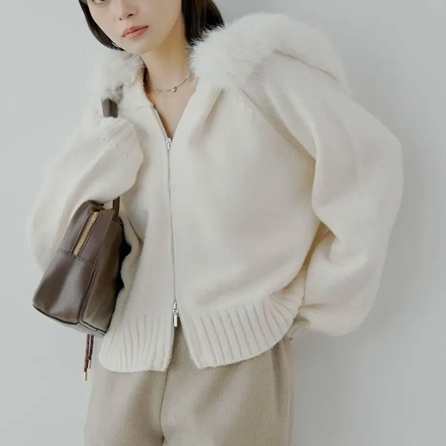 목 부분에 달린 볼륨감 있는 퍼는 탈부착 가능하므로, 기분이나 코디네이트에 맞춰 노카라의 심플한 가디건으로도 착용 가능합니다.
