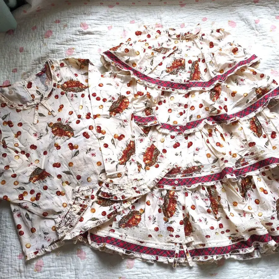 ❤️ 상세: 아주 귀여운 바구니 체리 패턴 단 스커트와 긴팔 블라우스 2세트입니다.