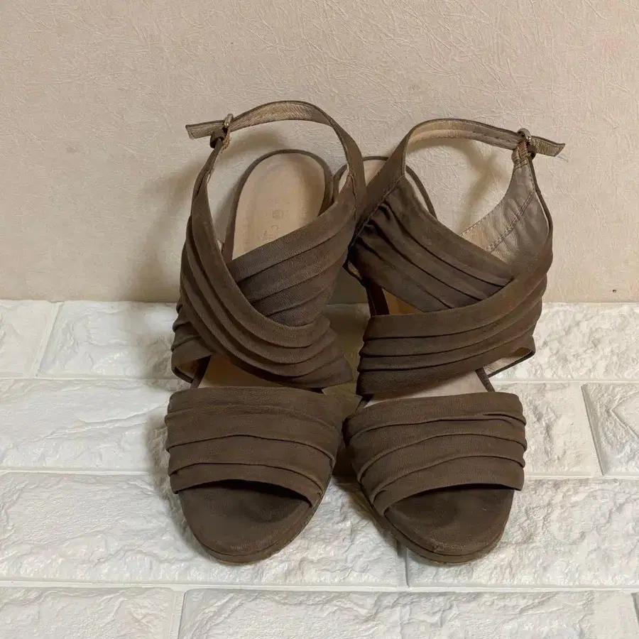 자동 번역되었어요. 원문보기스웨이드풍 브라운 샌들, 크로스 디자인과 스트랩으로 스타일리시합니다.