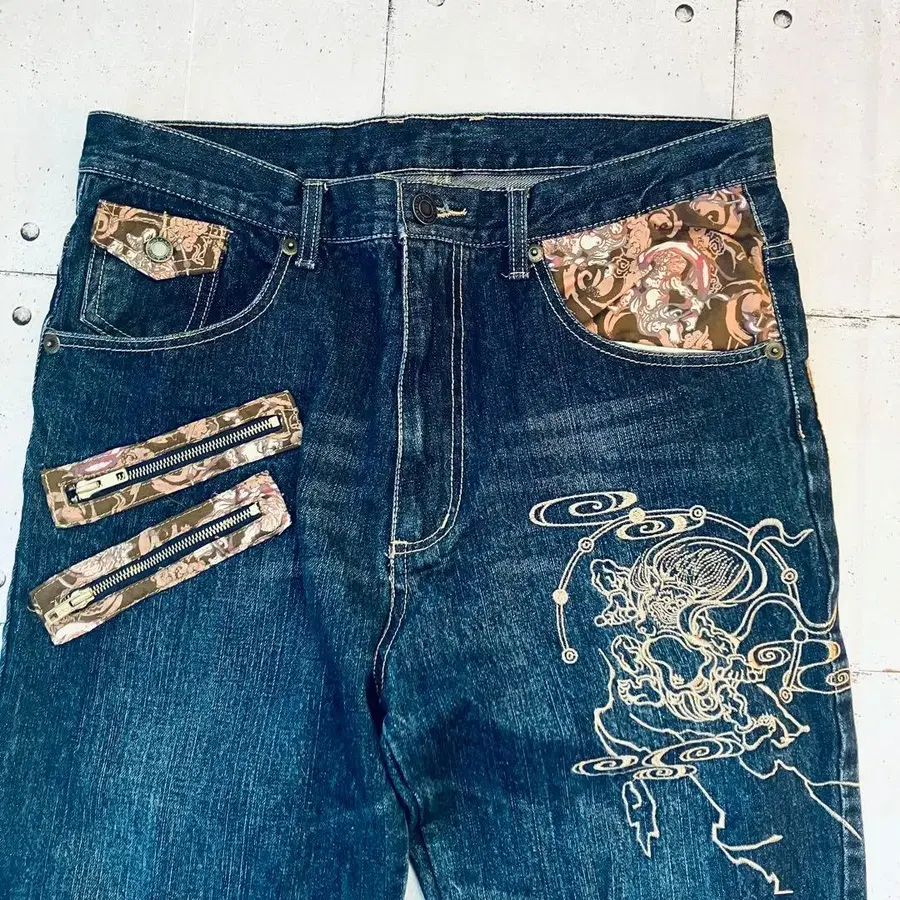 일본풍 패턴 자수가 눈길을 끄는 디자인 데님 팬츠입니다.
