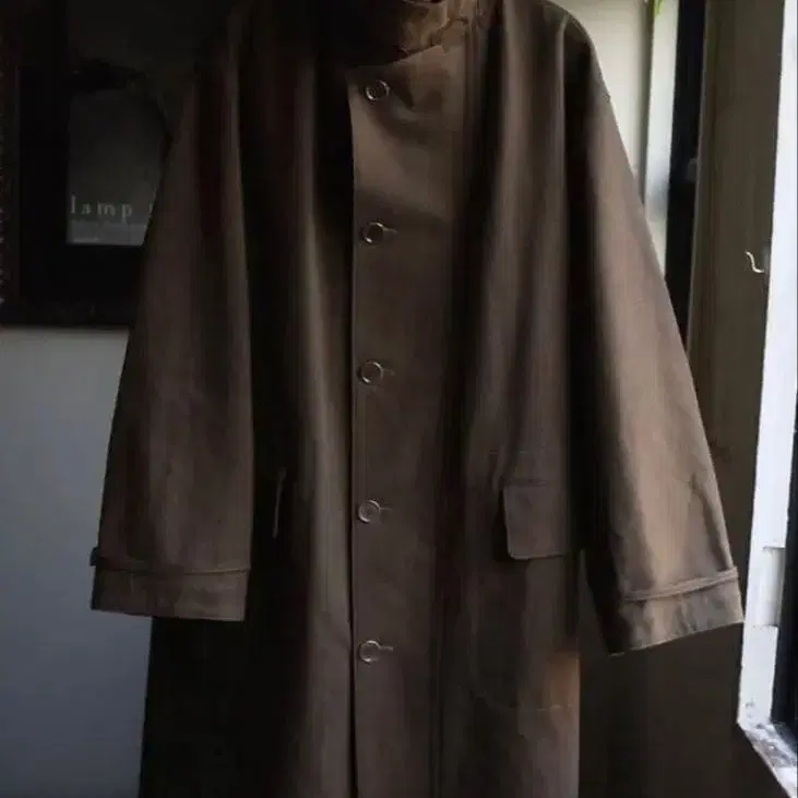 겉감과 동일한 컬러로 염색한 너트 버튼을 사용하여 투박함을 중화하고, 고급스러운 코트로 완성.