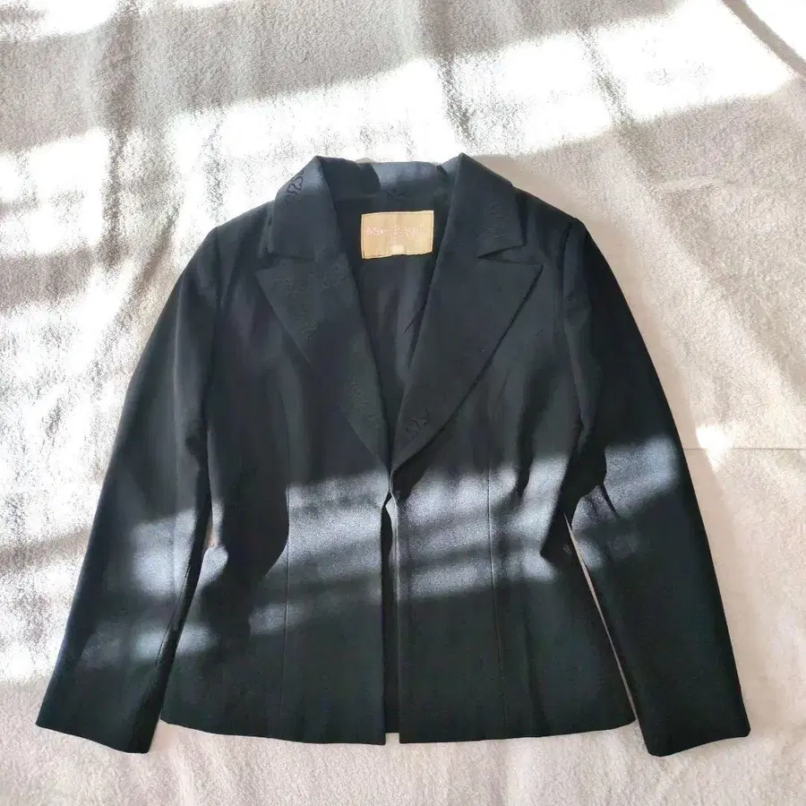 개성 있는 S자 자수가 옷깃과 소매에 들어간 블랙 자켓입니다.