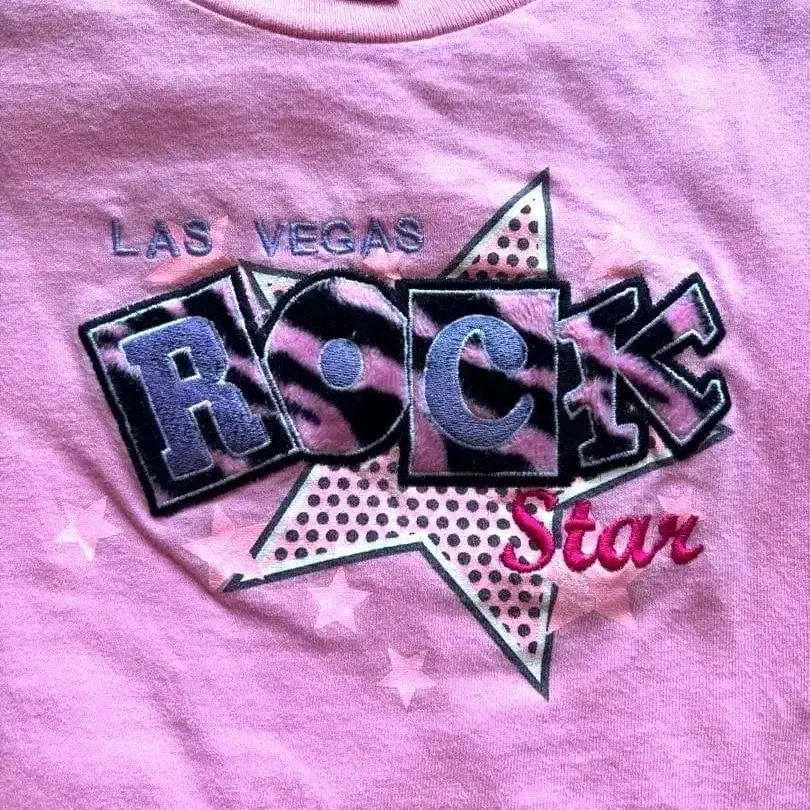 PINKLADY에서 구매한 구제 의류 T셔츠입니다. 패턴의 위치가 약간 오른쪽으로 치우쳐 있는데, 그 점도 뭔가 재미있고 귀엽습니다. ROCK 부분은 와펜으로 폭신폭신합니다. 5번째 사진처럼 등 뒤 하단에 작은 흑점이 있습니다.