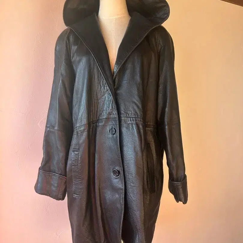 고급 램 가죽 후드 부착 블랙 가죽 코트 롱 자켓
