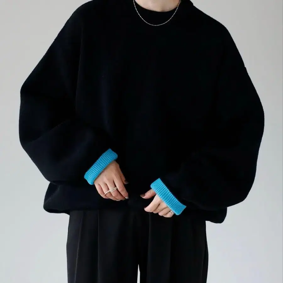 맨투맨 같은 심플한 실루엣에, 소매와 넥라인 안쪽에서 은근히 보이는 배색이 악센트가 된 바이컬러 니트 풀오버.