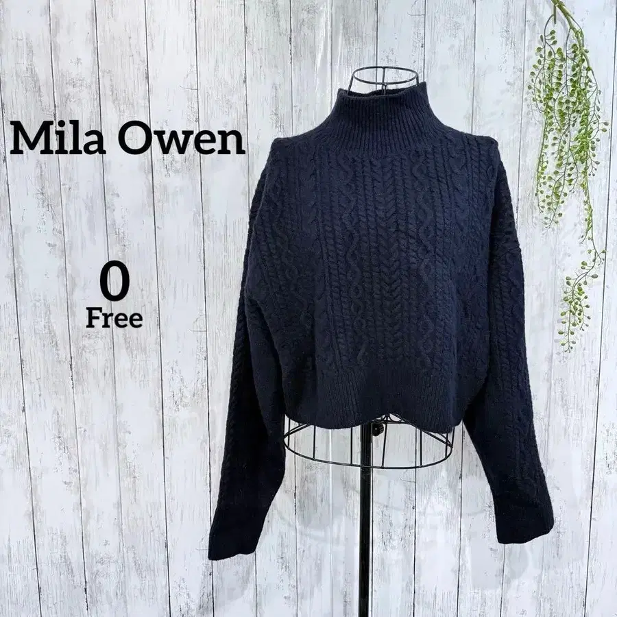 Mila Owen 케이블 짜임 하이넥 니트. 양모를 혼방한 소재를 사용했습니다. 릴랙스감 있는 실루엣과 숏 기장이 특징입니다. 색상은 다크 네이비입니다.