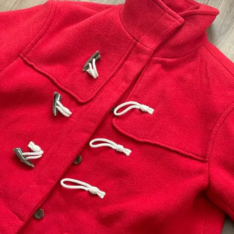 자동 번역되었어요. 원문보기플리스 소재의 빨간색 더플 코트, 토글 버튼과 높은 옷깃이 특징입니다.