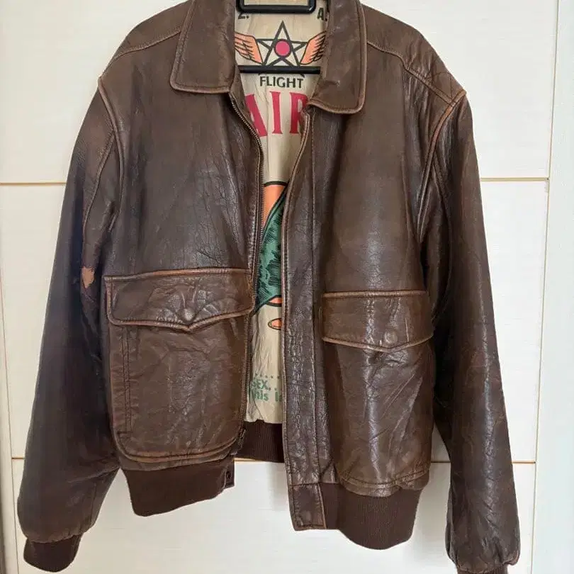 플라이트 테마 프린트가 들어간 브라운 가죽 자켓. - 색상: 브라운 - 디자인: 프론트 포켓 부착, 지퍼 부착 - 안쪽 디자인: 플라이트 테마 프린트 - 소재: 가죽 - 소매: 리브 부착 - 상태: 사용감 있음 (작은 흠집) 176cm 78kg일 때 짧은 기장으로 저스트하게 입었습니다. 방문해 주셔서 감사합니다.