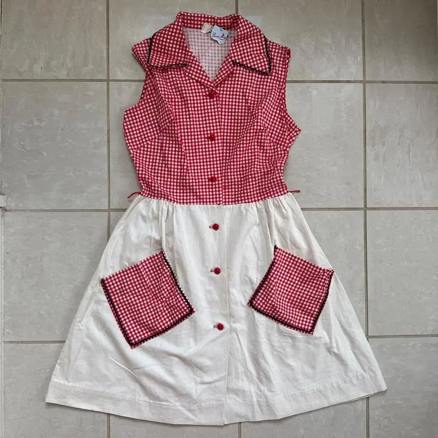 택 포함 새상품 빨간색과 화이트 깅엄 체크 슬리브리스 드레스 S