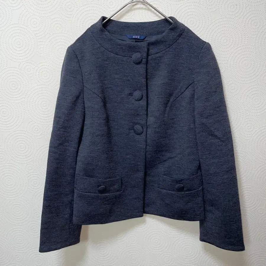 다크 그레이 색상의 노카라 자켓으로, 버튼이 달린 심플한 디자인입니다.