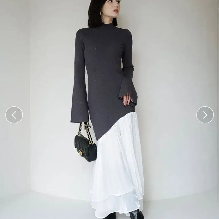비대칭 디자인의 니트 원피스, 플레어 슬리브와 프릴 스커트가 특징.