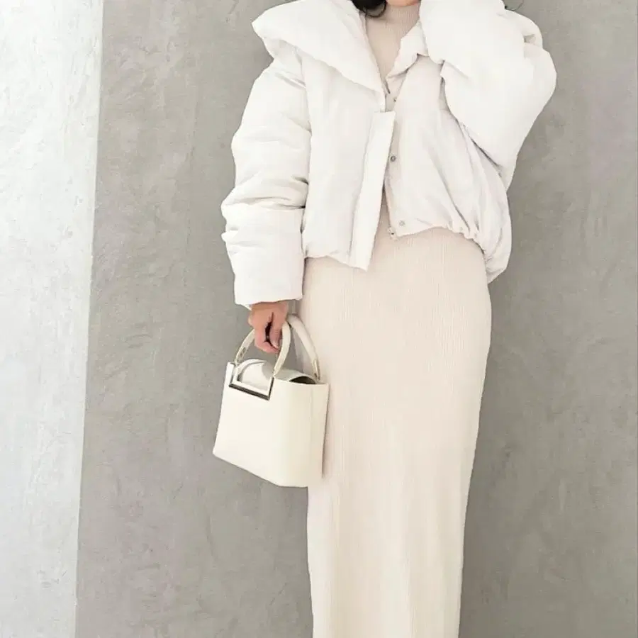 버튼이 달린 화이트 숏 다운 자켓, 사이드 포켓이 있어 기능적입니다.